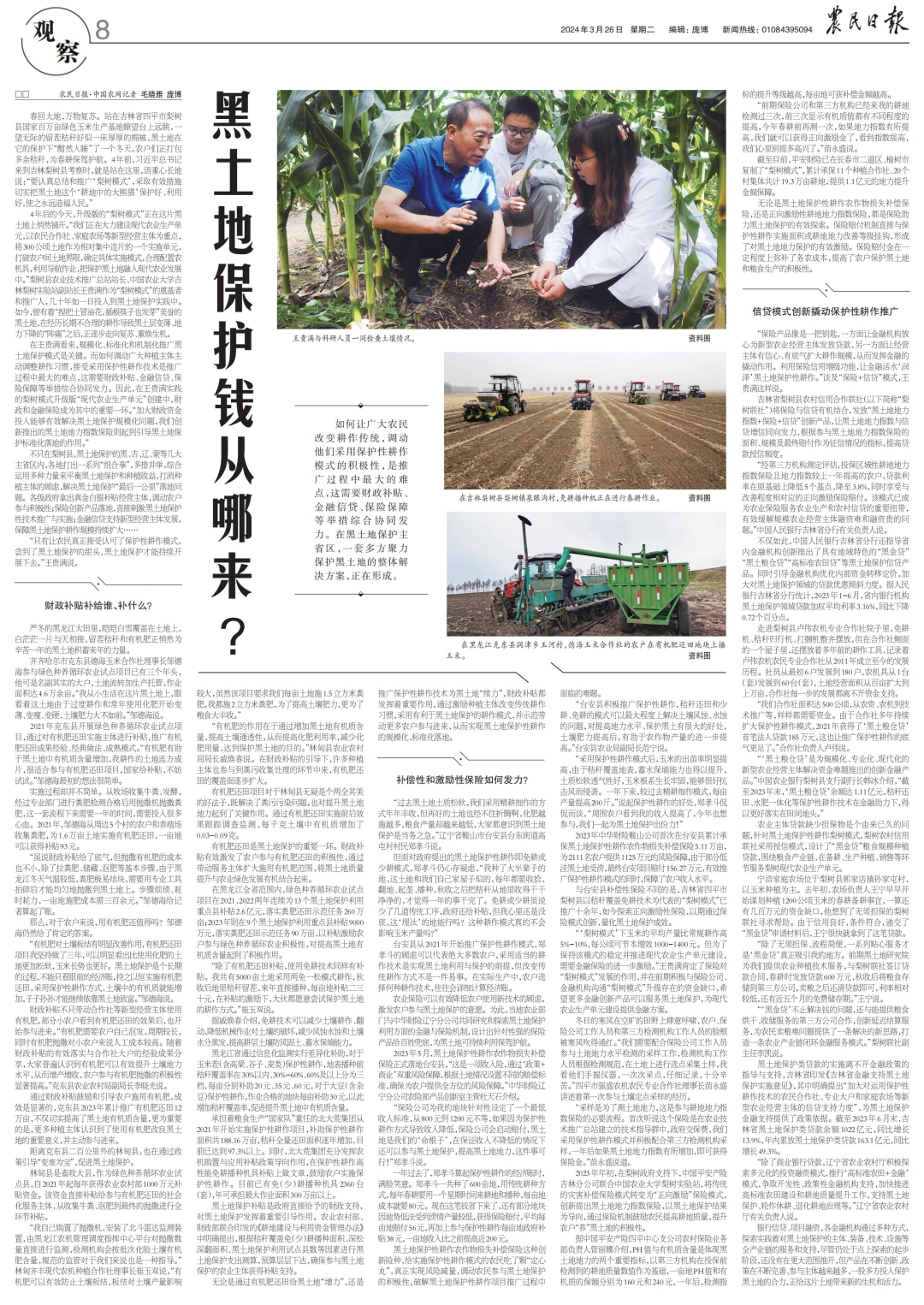 “保險(xiǎn)產(chǎn)品像是一把鑰匙,一方面讓金融機(jī)構(gòu)放心為新型農(nóng)業(yè)經(jīng)營(yíng)主體發(fā)放貸款,另一方面讓經(jīng)營(yíng)主體有信心、有底氣擴(kuò)大耕作規(guī)模,從而發(fā)揮金融的撬動(dòng)作用。利用保險(xiǎn)信用增級(jí)功能,讓金融活水‘潤(rùn)澤’黑土地保護(hù)性耕作。”談及“保險(xiǎn)+信貸”模式,王貴滿這樣說(shuō)。