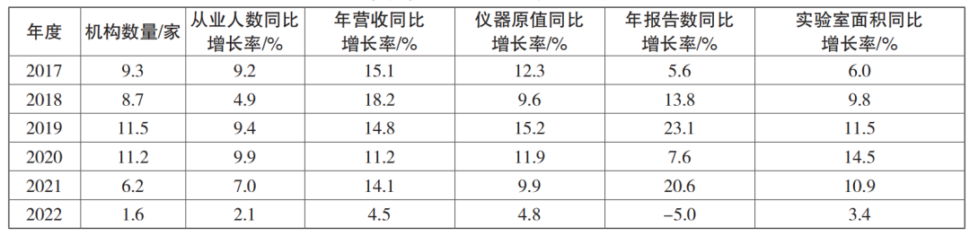 本文收集整理了2016—2022年度國家市場監(jiān)督管理總局發(fā)布的檢驗檢測服務(wù)業(yè)統(tǒng)計簡報數(shù)據(jù),如表1和表2所示,近年來我國檢驗檢測行業(yè)除2022年報告數(shù)同比下降5.0%外,在機(jī)構(gòu)數(shù)量、從業(yè)人數(shù)、年營收、儀器設(shè)備資產(chǎn)原值、實驗室面積等指標(biāo)上均實現(xiàn)了逐年增長,表明我國檢驗檢測行業(yè)整體仍處于成長期,吸引了大量資本入局。但2022年度各項指標(biāo)增速均明顯放緩,反映了行業(yè)已告別野蠻擴(kuò)張期,迎來發(fā)展拐點(diǎn),市場競爭加劇、投資熱情下降,淘汰洗牌和轉(zhuǎn)型升級將成為行業(yè)后續(xù)主旋律。